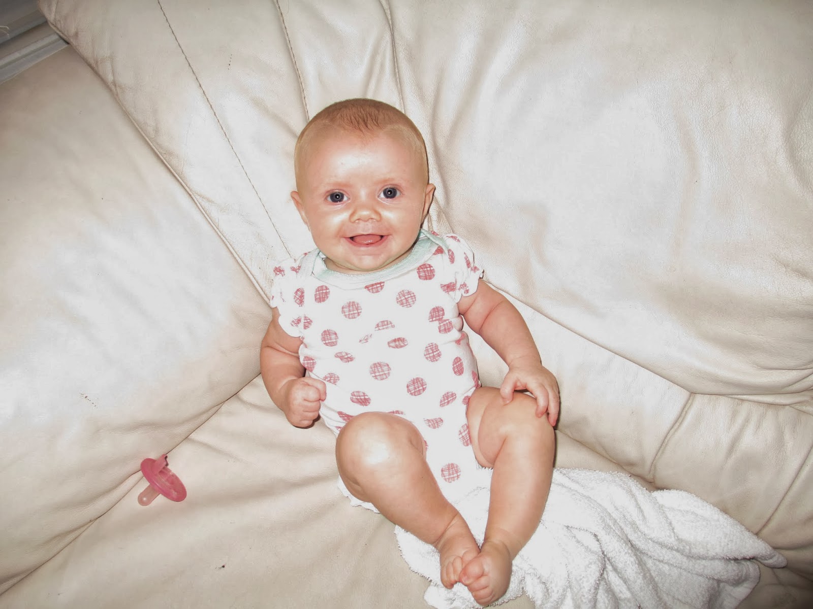 She's great at taking naps. She rolls over and tries to sit up all by herself! Her hair is growing back :) Her favorite place to be is on her daddy's shoulders and she loves watching us. Since Daddy is usually already up for her midnight feeding, he's kind of taken them over. Its her best time of day. She is so happy and snuggly and perfectly content with everything. Lots of Daddy Daughter date nights... but sometimes, mommy crashes em because, seriously, she's just too cute to stay away!!!